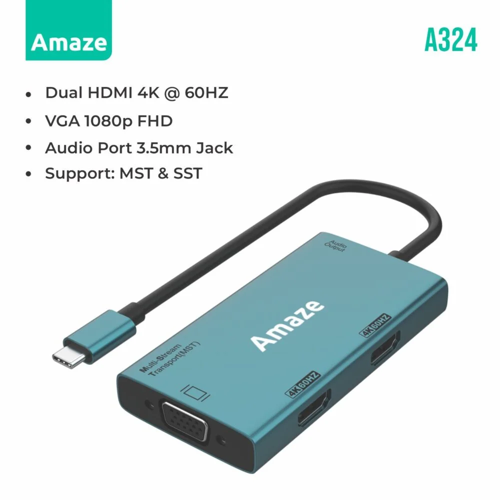The Amaze Type C to Dual HDMI + VGA + Audio Hub with MST (Multi-Stream Transport) function is a versatile multiport adapter designed to expand connectivity options for laptops and other devices with Type C to Dual HDMI + VGA + Audio Hub. This hub enables users to connect multiple displays and other peripherals simultaneously, enhancing productivity and flexibility.